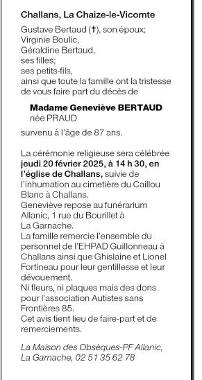 Cet espace « condoléances » est dédié à la mémoire de Madame Geneviève BERTAUD née PRAUD.