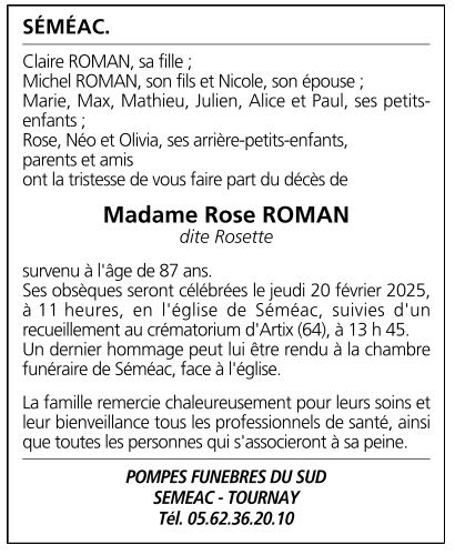 Cet espace « condoléances » est dédié à la mémoire de Madame Rose ROMAN née CAZAL.