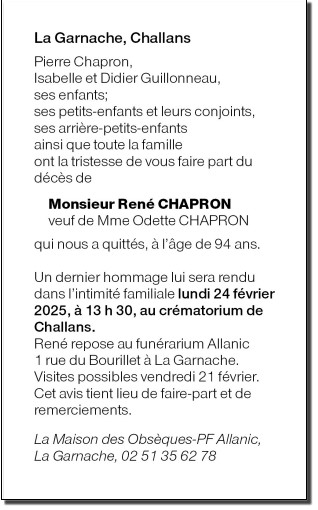 Cet espace « condoléances » est dédié à la mémoire de Monsieur René CHAPRON.