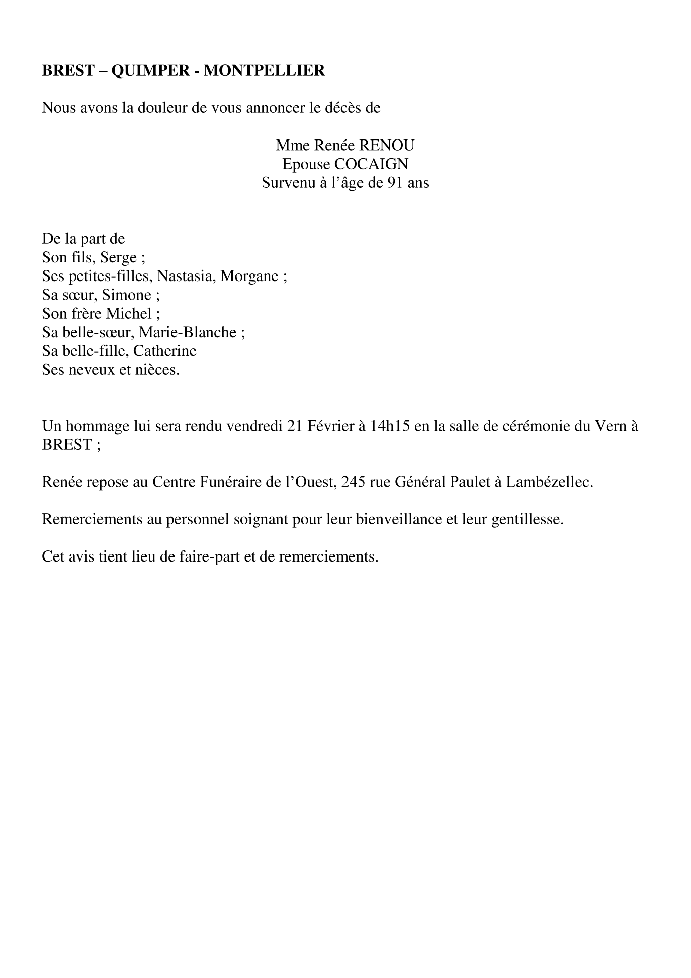 de Madame Renée COCAIGN née RENOU