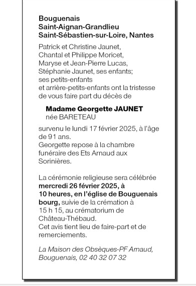 Cet espace « condoléances » est dédié à la mémoire de Madame Georgette JAUNET née BARETEAU.