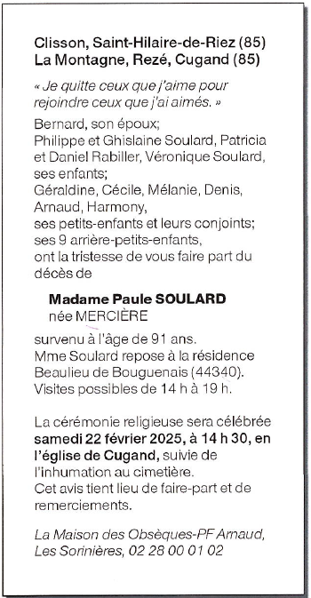 de Madame Paule SOULARD née MERCIERE
