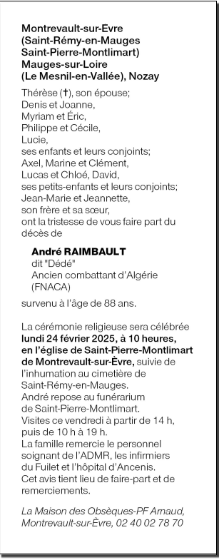 Cet espace « condoléances » est dédié à la mémoire de Monsieur André RAIMBAULT.