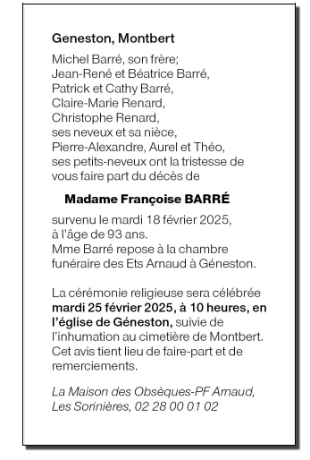 Cet espace « condoléances » est dédié à la mémoire de Madame Françoise BARRÉ.