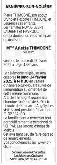 Cet espace « condoléances » est dédié à la mémoire de Madame Arlette THIMOGNÉ née ROY.