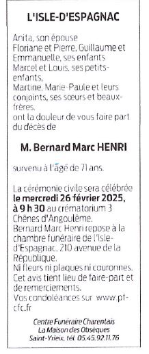 Cet espace « condoléances » est dédié à la mémoire de Monsieur Bernard HENRI.