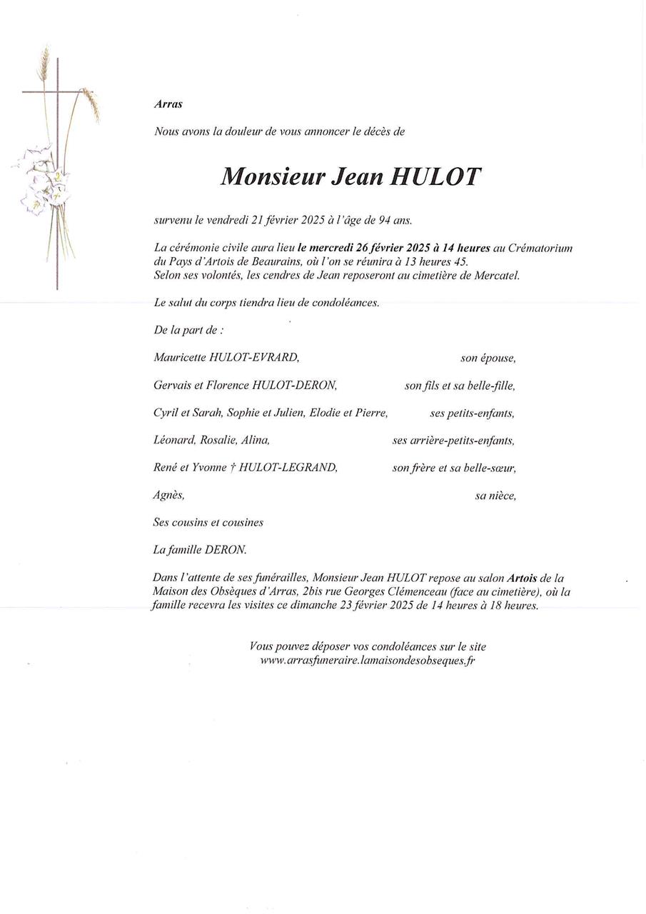 Cet espace « condoléances » est dédié à la mémoire de Monsieur Jean HULOT.