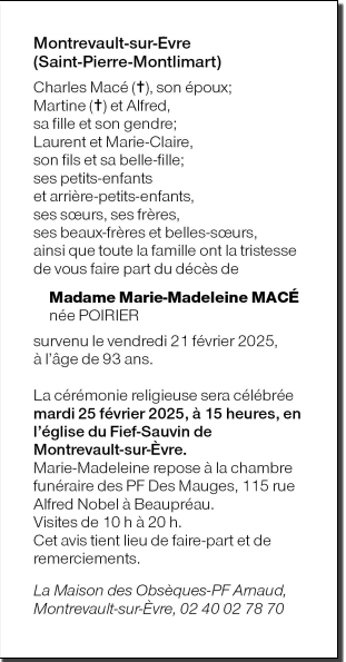 Cet espace « condoléances » est dédié à la mémoire de Madame Marie-Madeleine MACE née POIRIER.