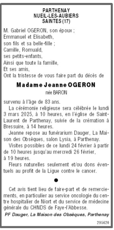 Cet espace « condoléances » est dédié à la mémoire de Madame Jeanne OGERON née BARON.