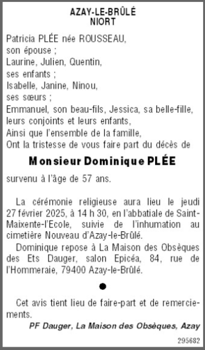 Cet espace « condoléances » est dédié à la mémoire de Monsieur Dominique PLÉE.