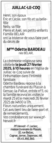 Cet espace « condoléances » est dédié à la mémoire de Madame Odette BARDEAU née BÉLAIR.