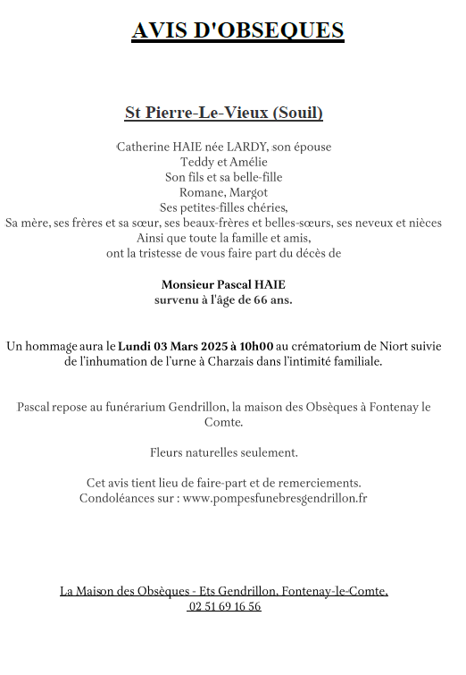 Cet espace « condoléances » est dédié à la mémoire de Monsieur Pascal HAIE.