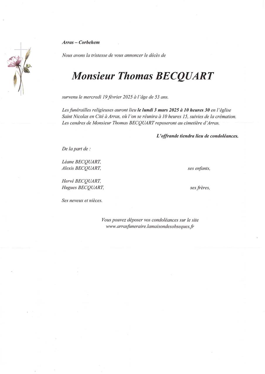 Cet espace « condoléances » est dédié à la mémoire de Monsieur Thomas BECQUART.