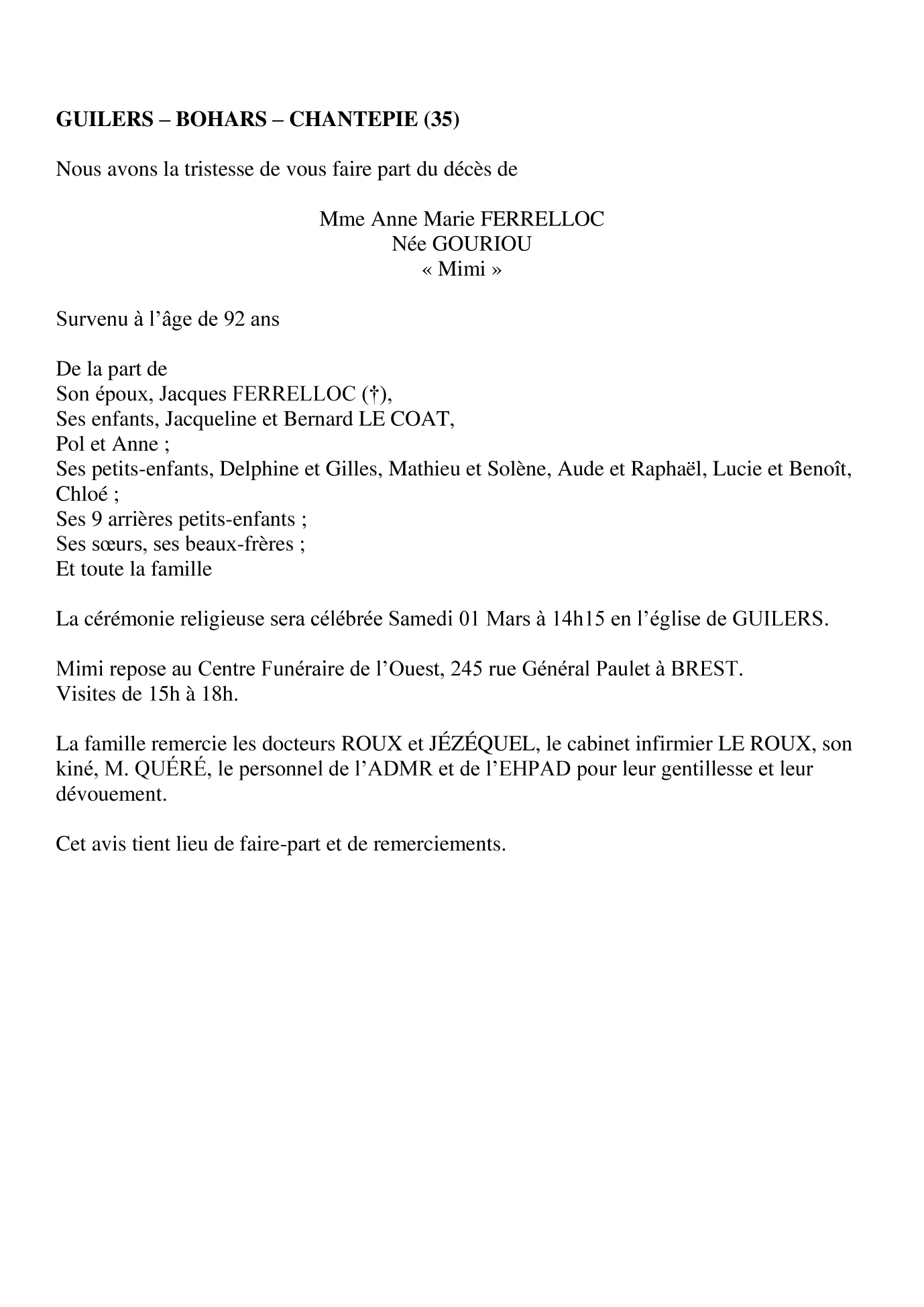 Cet espace « condoléances » est dédié à la mémoire de Madame Anne Marie FERRELOC née GOURIOU.