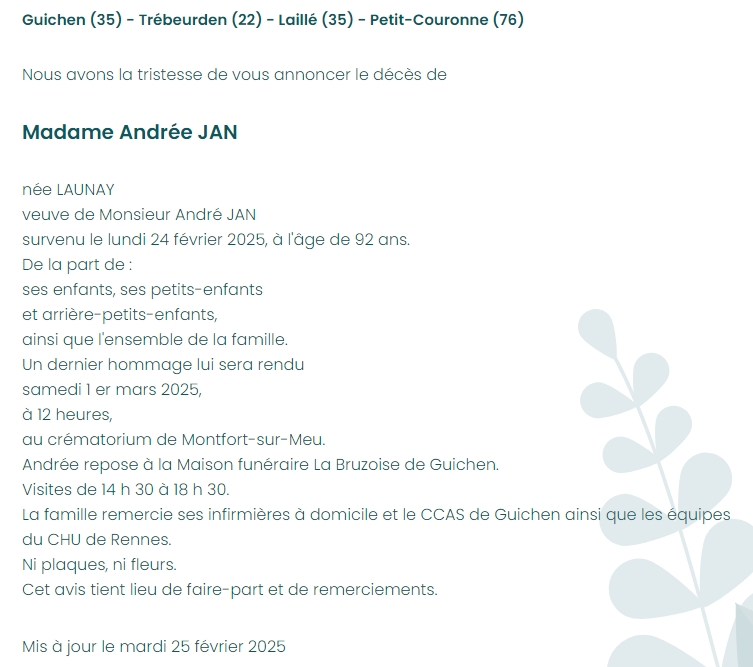 Cet espace « condoléances » est dédié à la mémoire de Madame Andrée JAN née LAUNAY.