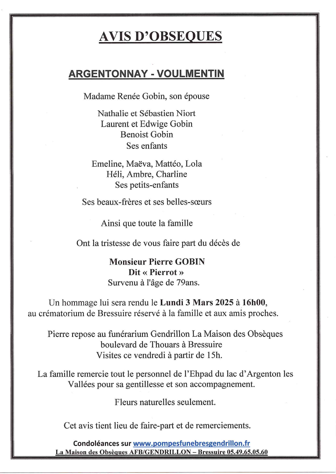 Cet espace « condoléances » est dédié à la mémoire de Monsieur Pierre GOBIN.