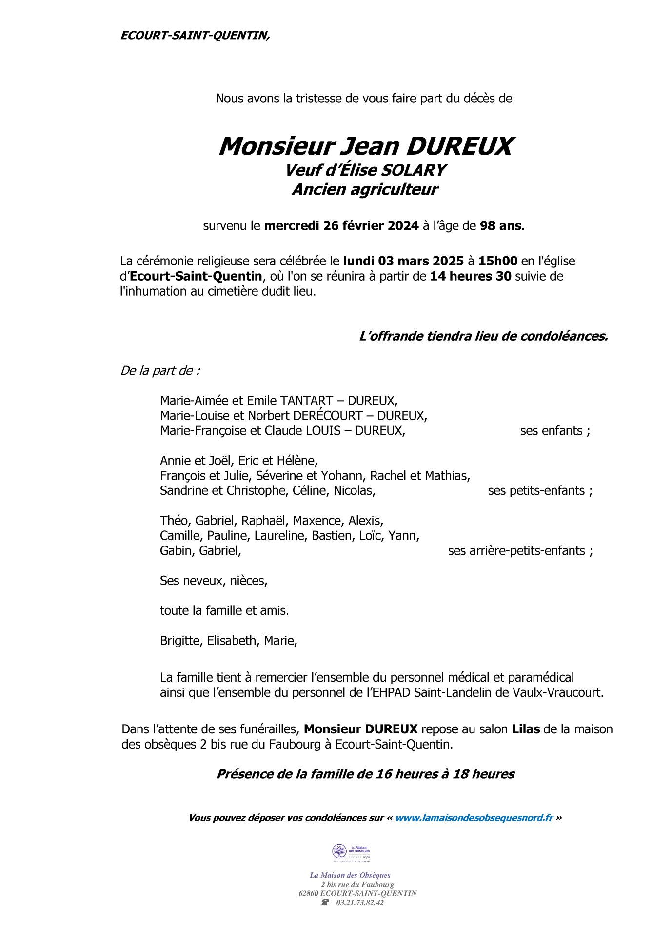 Cet espace « condoléances » est dédié à la mémoire de Monsieur Jean DUREUX.