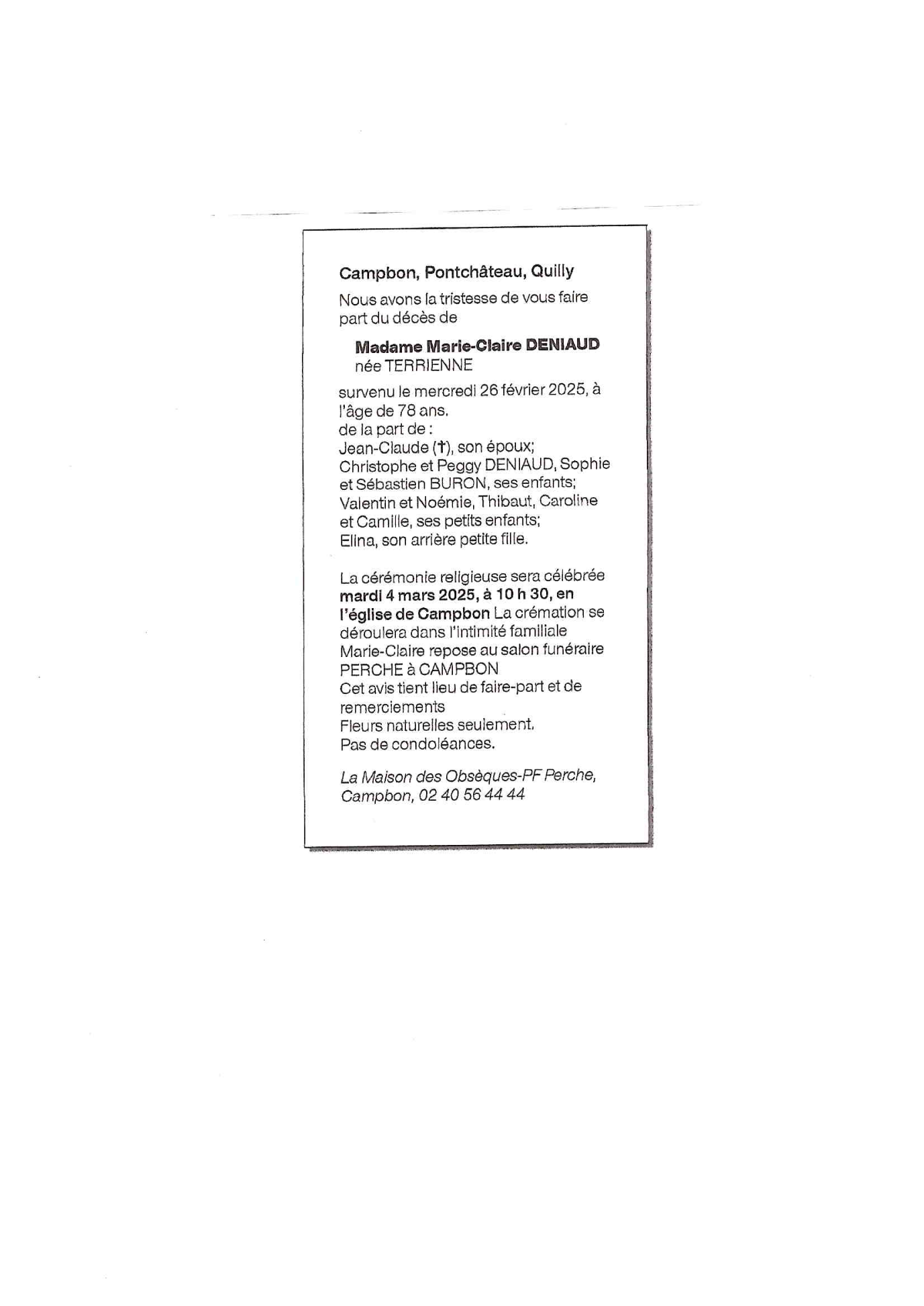 de Madame Marie-Claire DENIAUD née TERRIENNE