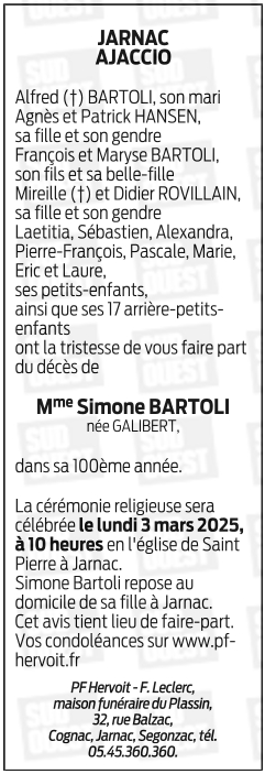 Cet espace « condoléances » est dédié à la mémoire de Madame Simone BARTOLI née GALIBERT.