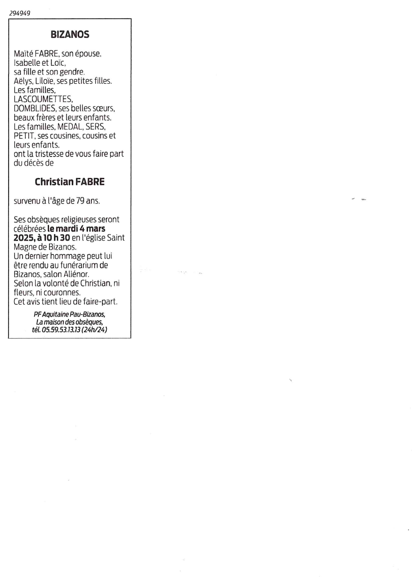 Décédé à Bizanos (64320) le mercredi 26 février 2025