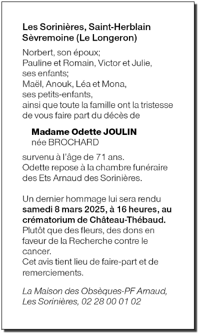 Cet espace « condoléances » est dédié à la mémoire de Madame Odette JOULIN née BROCHARD.