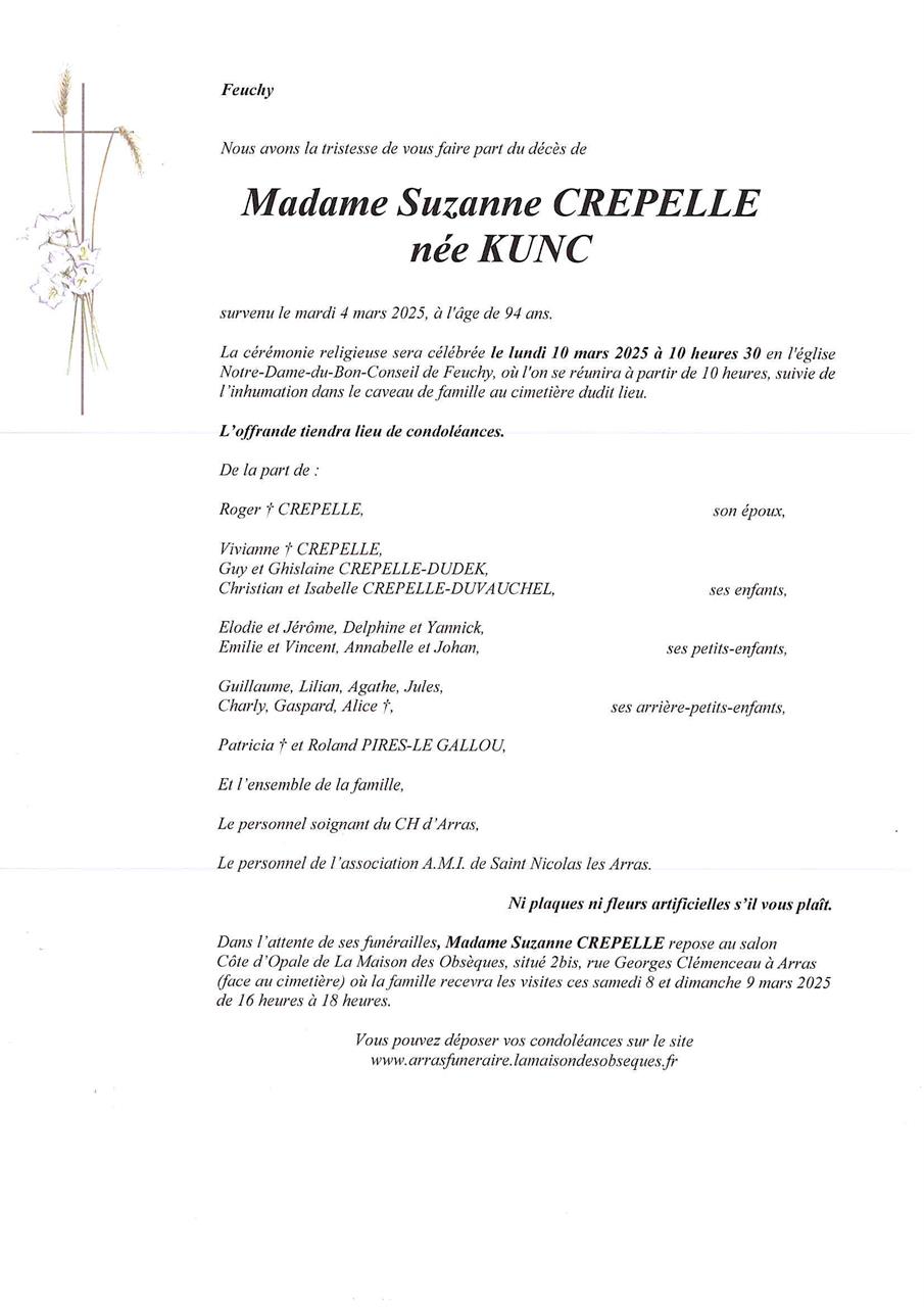 de Madame Suzanne CREPELLE née KUNC