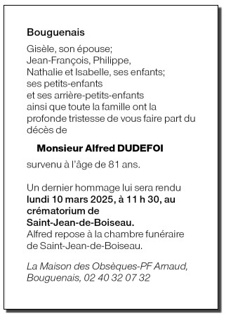 Cet espace « condoléances » est dédié à la mémoire de Monsieur Alfred DUDEFOI.
