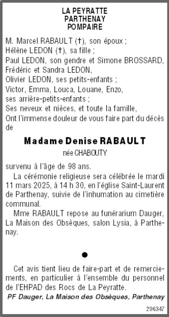 Cet espace « condoléances » est dédié à la mémoire de Madame Denise RABAULT née CHABOUTY.