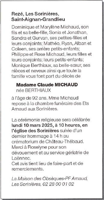 de Madame Claude MICHAUD née BERTHIAUX