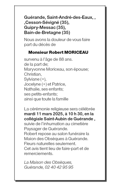 Cet espace « condoléances » est dédié à la mémoire de Monsieur Robert MORICEAU.