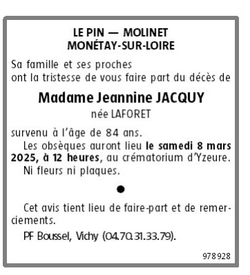 Cet espace « condoléances » est dédié à la mémoire de Madame Jeannine JACQUY née LAFORET.