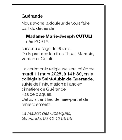 Cet espace « condoléances » est dédié à la mémoire de Madame Marie CUTULI née PORTAL.
