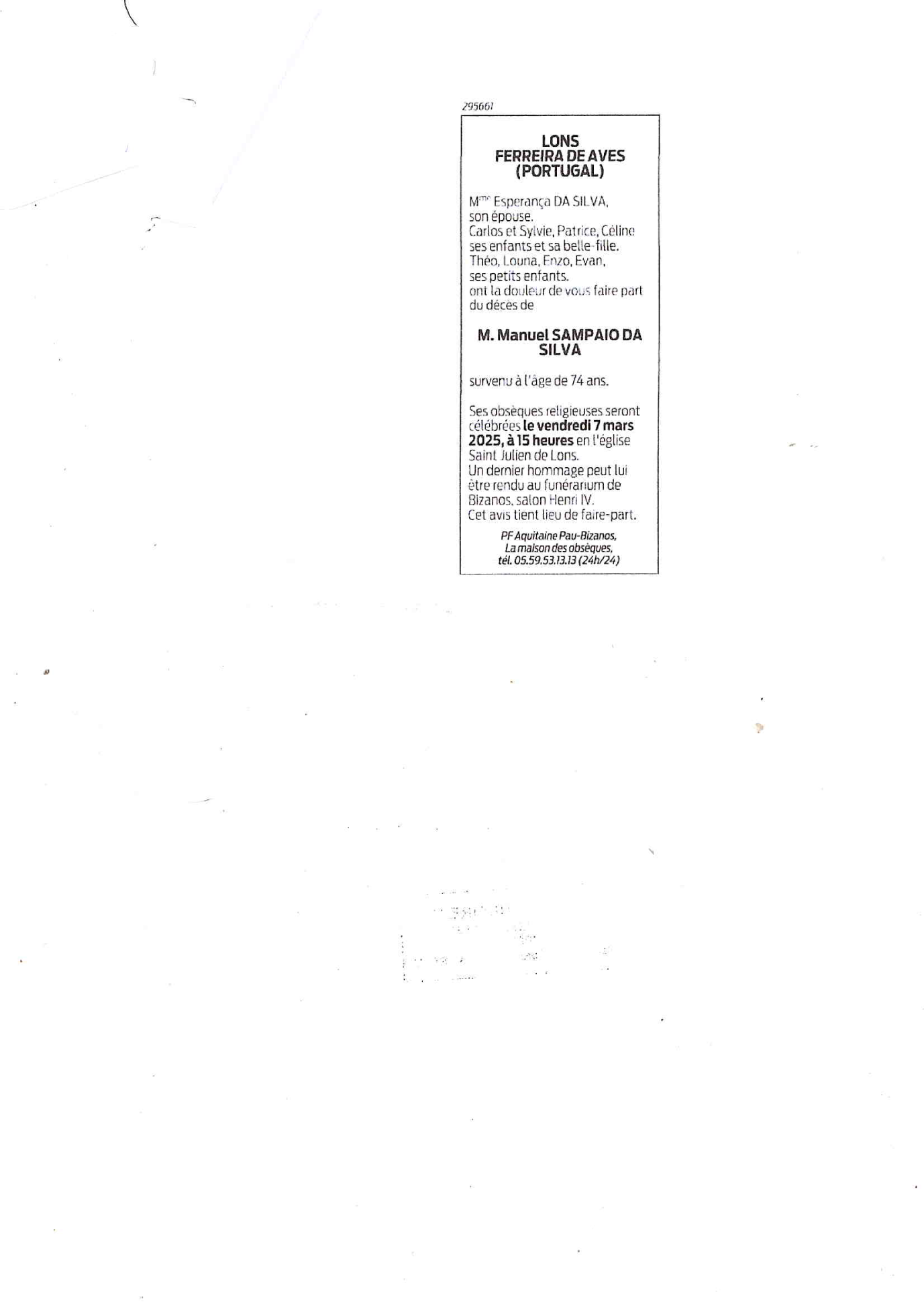 Cet espace « condoléances » est dédié à la mémoire de Monsieur Manuel SAMPAIO DA SILVA.