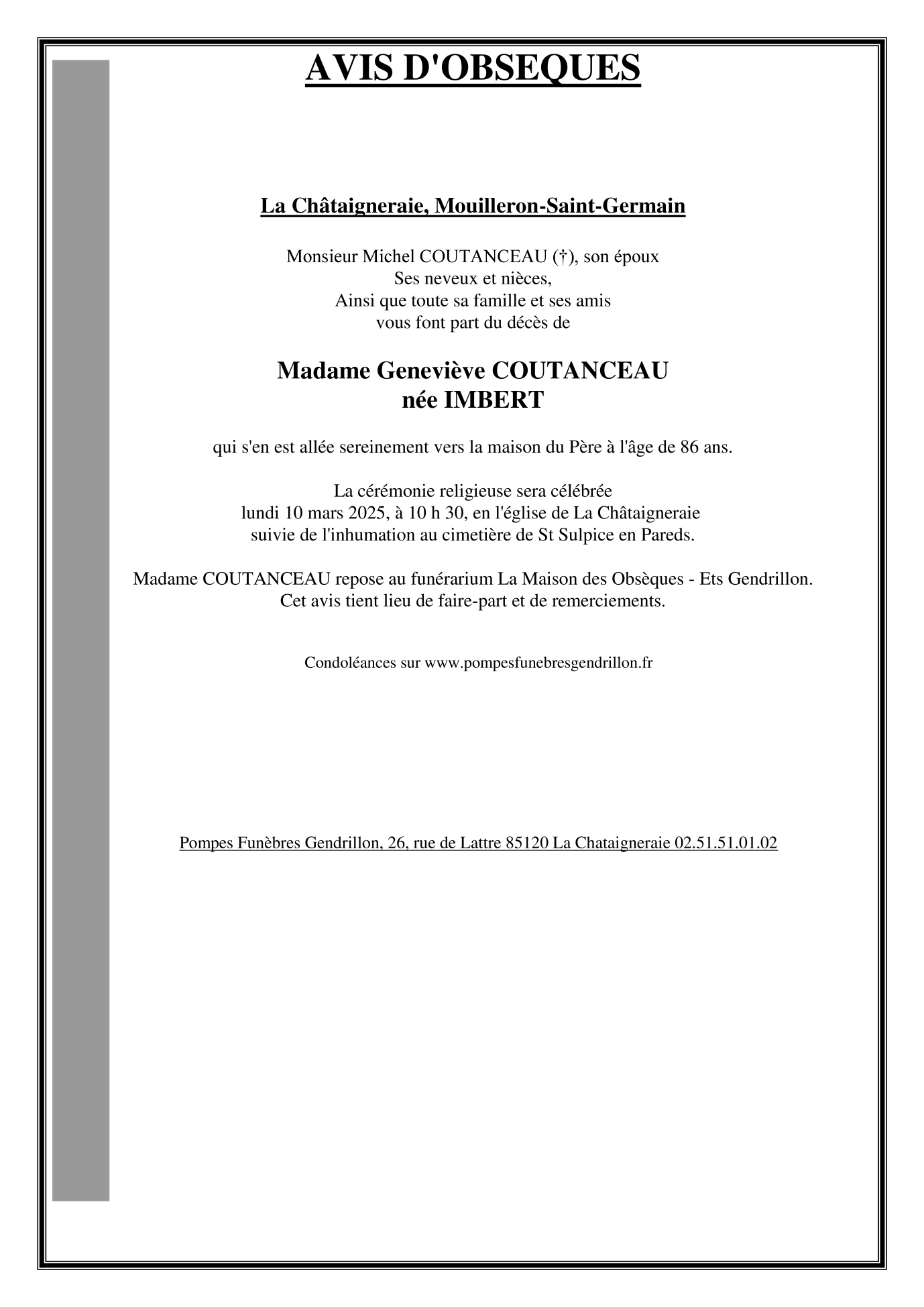 de Madame Genevieve COUTANCEAU née IMBERT