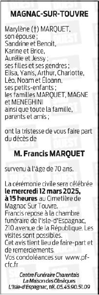 Cet espace « condoléances » est dédié à la mémoire de Monsieur FRANCIS MARQUET.