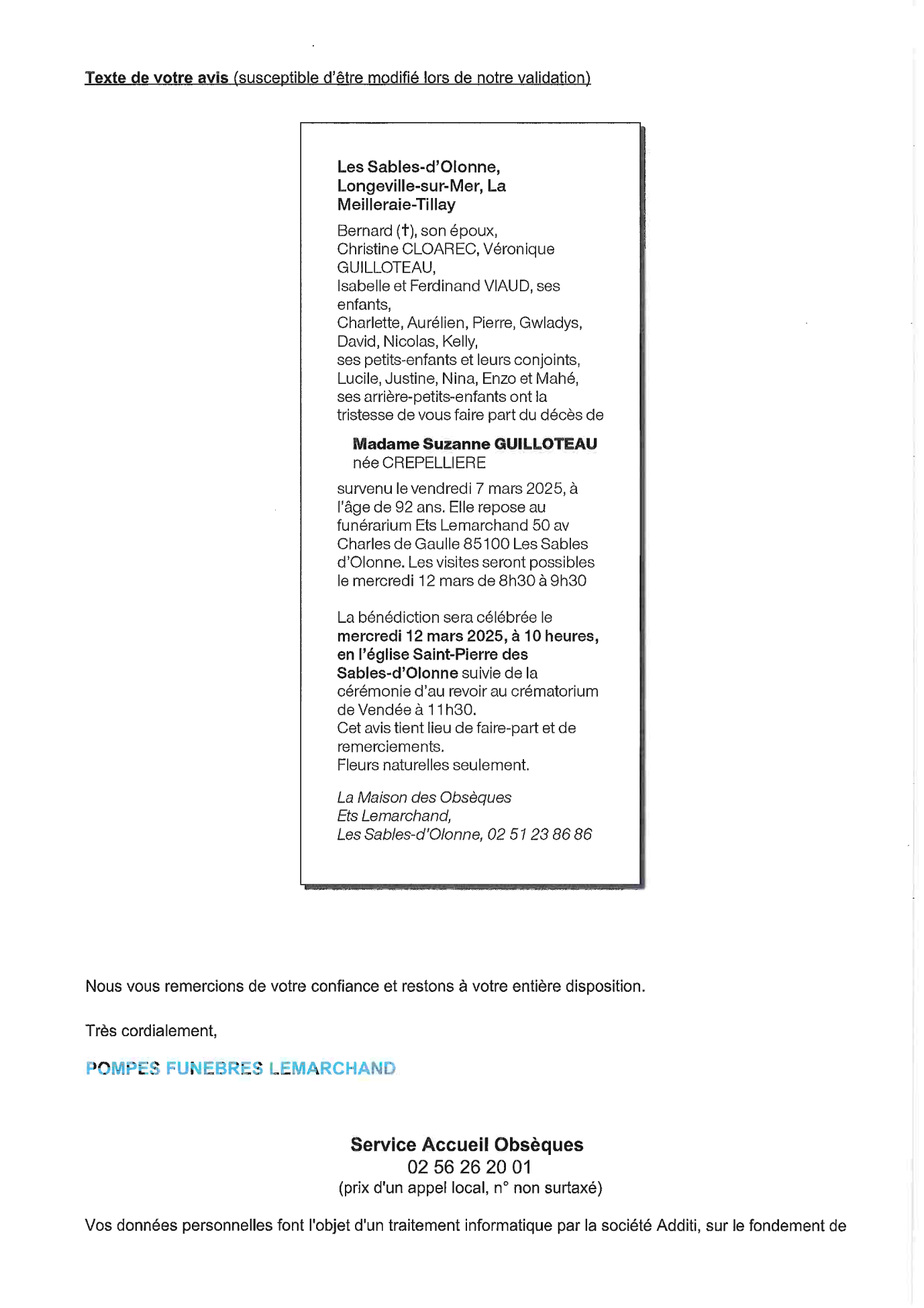 de Madame Suzanne GUILLOTEAU née CREPELLIERE
