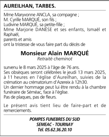 Cet espace « condoléances » est dédié à la mémoire de Monsieur Alain MARQUÉ.