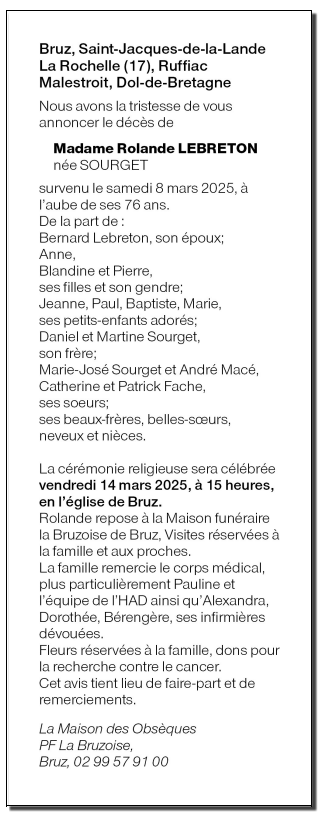 Cet espace « condoléances » est dédié à la mémoire de Madame Rolande LEBRETON née SOURGET.
