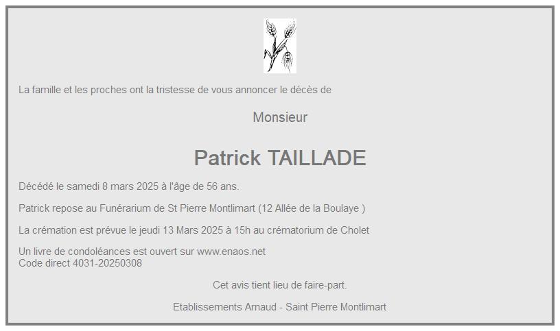 Cet espace « condoléances » est dédié à la mémoire de Monsieur Patrick TAILLADE.
