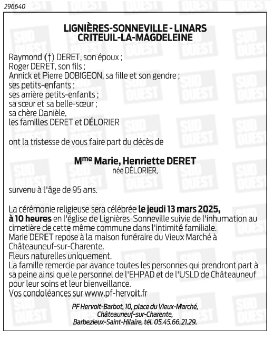 Cet espace « condoléances » est dédié à la mémoire de Madame Marie Henriette DERET née DÉLORIER.