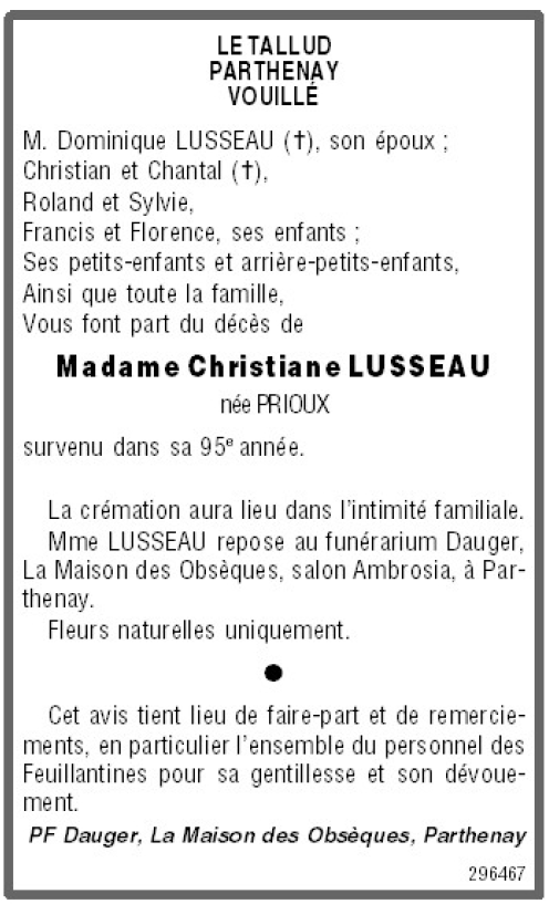 Cet espace « condoléances » est dédié à la mémoire de Madame Christiane LUSSEAU née PRIOUX.