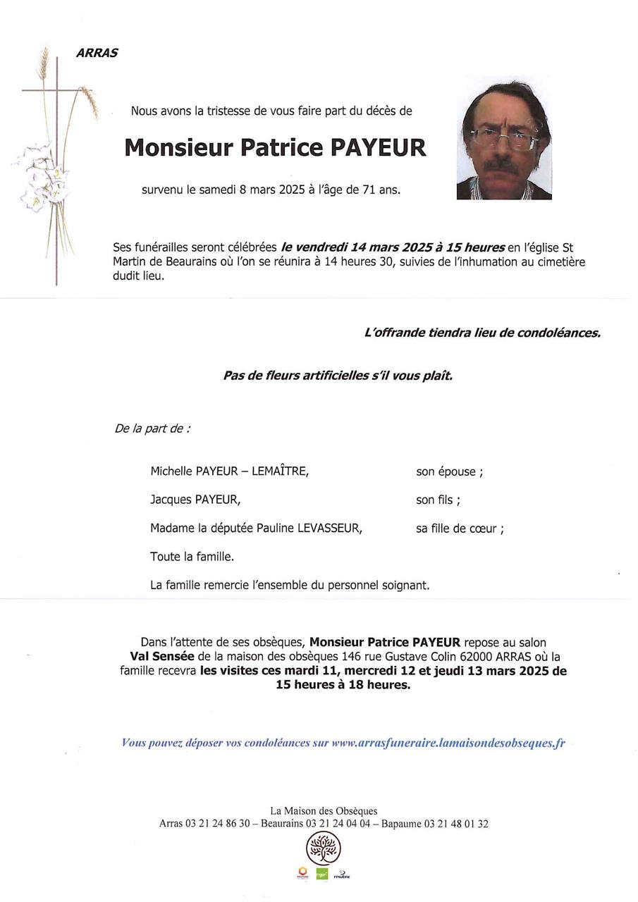 Cet espace « condoléances » est dédié à la mémoire de Monsieur Patrice PAYEUR.