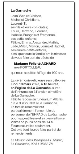 Cet espace « condoléances » est dédié à la mémoire de Madame Félicité ACHARD née PORTOLLEAU.