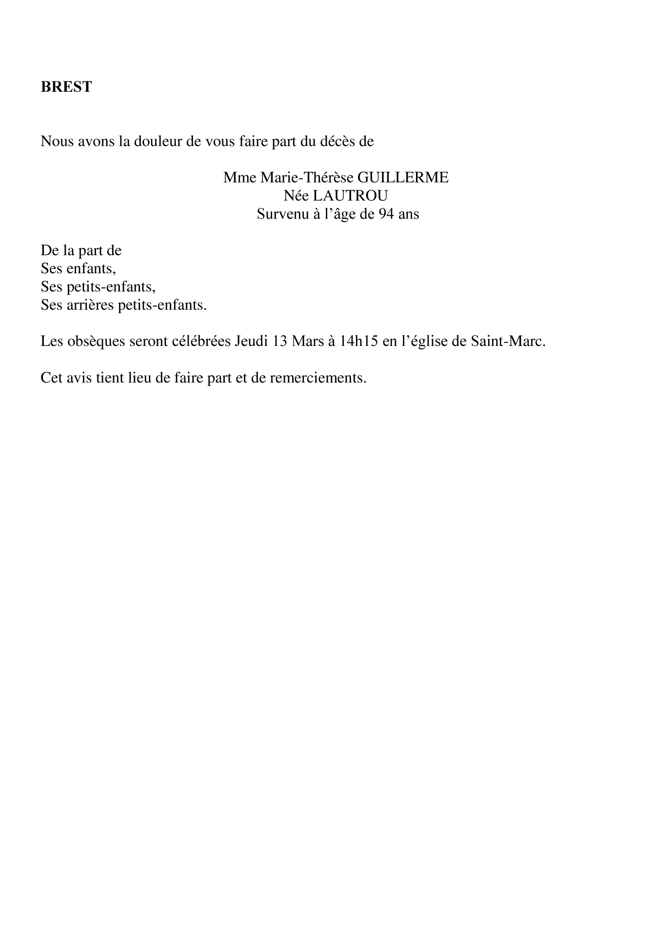 de Madame Marie-Thérèse GUILLERME née LAUTROU