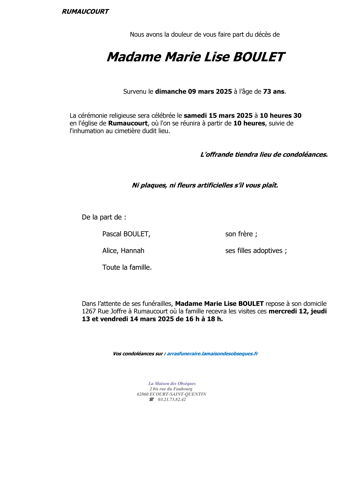 N’hésitez pas à renseigner cette page à vos connaissances. Ceux qui sont loin ou qui n’ont pas la possibilité de se joindre à la cérémonie trouveront ici une façon simple de montrer leurs sentiments à la famille dans ce moment difficile.