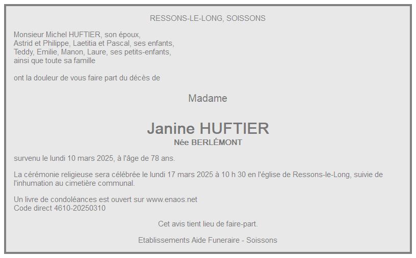 de Madame Janine HUFTIER née BERLÉMONT