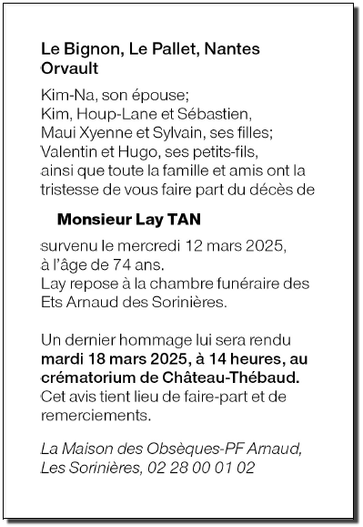 Cet espace « condoléances » est dédié à la mémoire de Monsieur Lay TAN.
