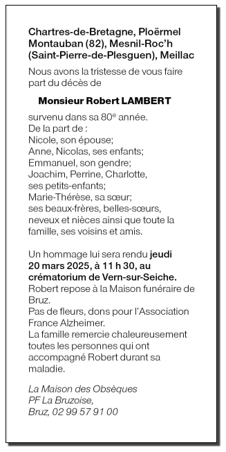 Cet espace « condoléances » est dédié à la mémoire de Monsieur Robert LAMBERT.