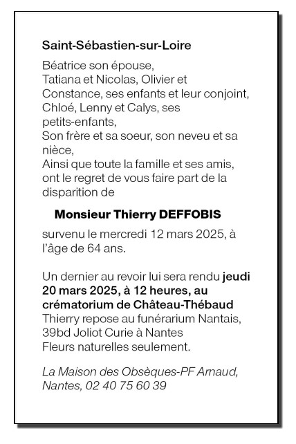 Cet espace « condoléances » est dédié à la mémoire de Monsieur Thierry DEFFOBIS.