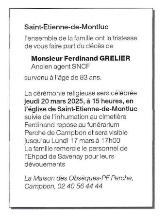 Cet espace « condoléances » est dédié à la mémoire de Monsieur FERDINAND GRELIER.